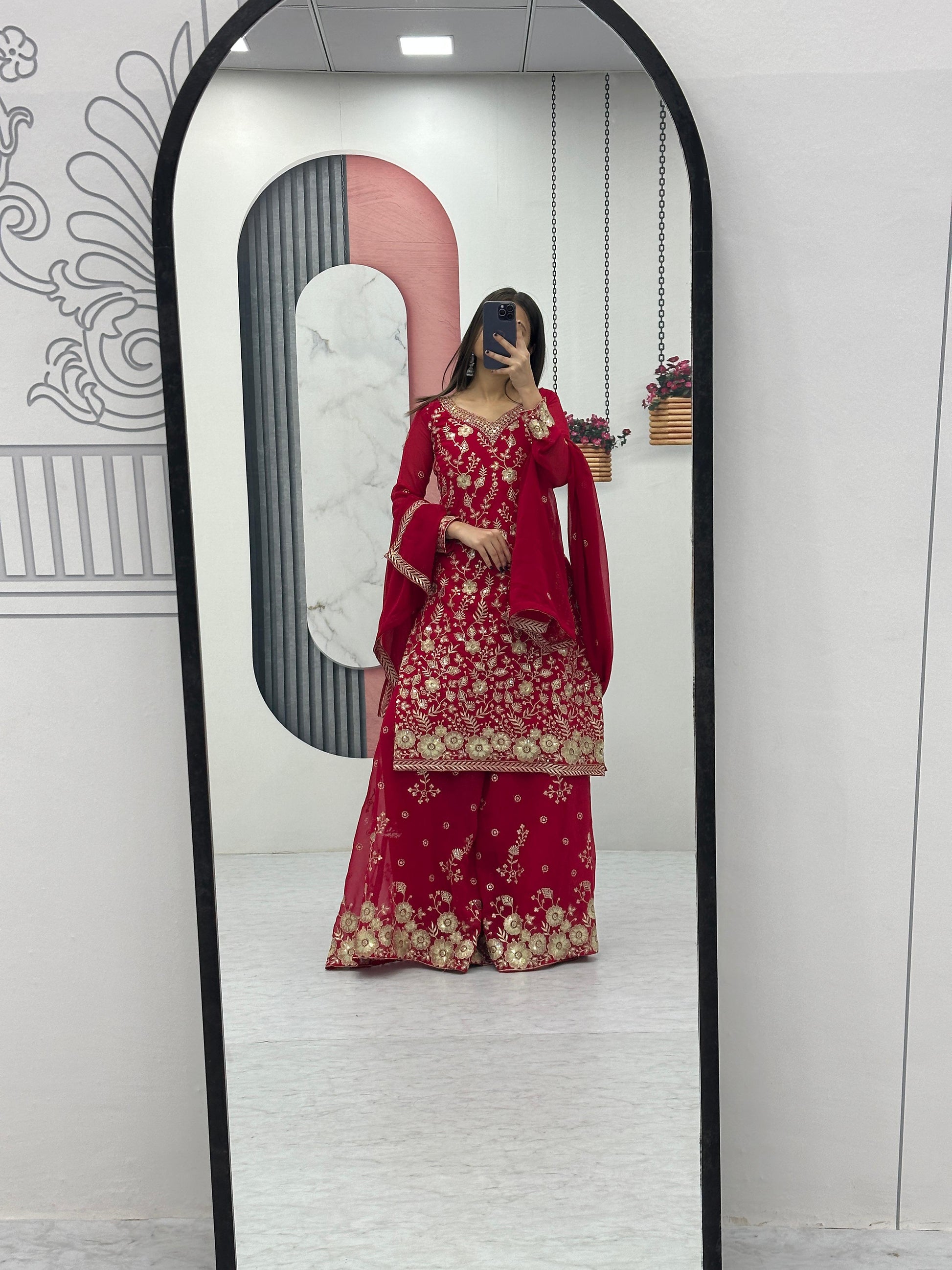 Beautiful Party Wear Sharara Suit With Heavy Embroidery Sequence Work With Fancy Sleeves ( MAS_PF_028_Pink )